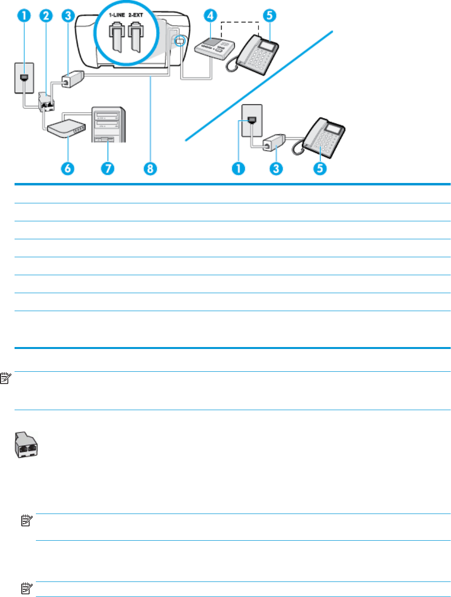 RJ-11-portar på baksidan. Använd inte en linjedelare med två ledningar, en seriell linjedelare eller en parallell