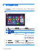 2 在开始屏幕中导航 “开始”屏幕提供了一个中心位置,从中可访问信息和电子邮件、浏览网页、流式传输视频、查看照片和 访问社交媒体网站。 注: 您的笔记本计算机的“开始”屏幕可能与以下插图有所不同。 操作 使用键盘和鼠标 使用触摸手势 (1) 打开应用 单击“开始”屏幕上的应用。 点击“开始”屏幕上的应用。 (2) 显示超级按钮(搜索、共 享、开始、设备和设置) 指向“开始”屏幕的右上角或右下角。 从触摸板或触摸屏右侧滑入。 (3) 查找笔记本计算机上的所 有应用列表 指向“开始”屏幕的左下方区域,然后再 在触摸板或触摸屏上向左滑动,直到 次单击箭头。 出现箭头,然后点击“开始”屏幕左下角 的箭头。 要返回到“开始”屏幕,请再次单击箭 头。 要返回到“开始”屏幕,请再次点击箭 头。 注: 在选定的触摸屏机型中,向上 滑动以显示笔记本计算机上的所有应 用列表,向下滑动以返回到“开始”屏 幕。 2 (4) 显示“开始”菜单 指向“开始”屏幕的左下方区域,然后右 点击桌面应用,然后按下并释放左下 键单击开始按钮。 角的开始按钮。 (5) 在打开的应用间切换 指向“开始”屏幕