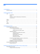 Indeks A adaptor AC, menguji 48 alat penunjuk, mengeset preferensi 22 antena nirkabel, mengenali 11 antena WLAN, mengenali 11 antena WWAN, mengenali 11 B baterai membuang 46 menampilkan sisa daya baterai 42 mengganti 46 menghemat daya 45 mengosongkan daya 42 menyimpan 45 tingkat sediaan daya baterai yang rendah 42 bepergian dengan membawa komputer 45, 92, 94 BIOS memperbarui 84 men-download pembaruan 85 menentukan versi 85 C Computer Setup menavigasi dan memilih 83 mengembalikan pengaturan pabrik 84 Sandi a