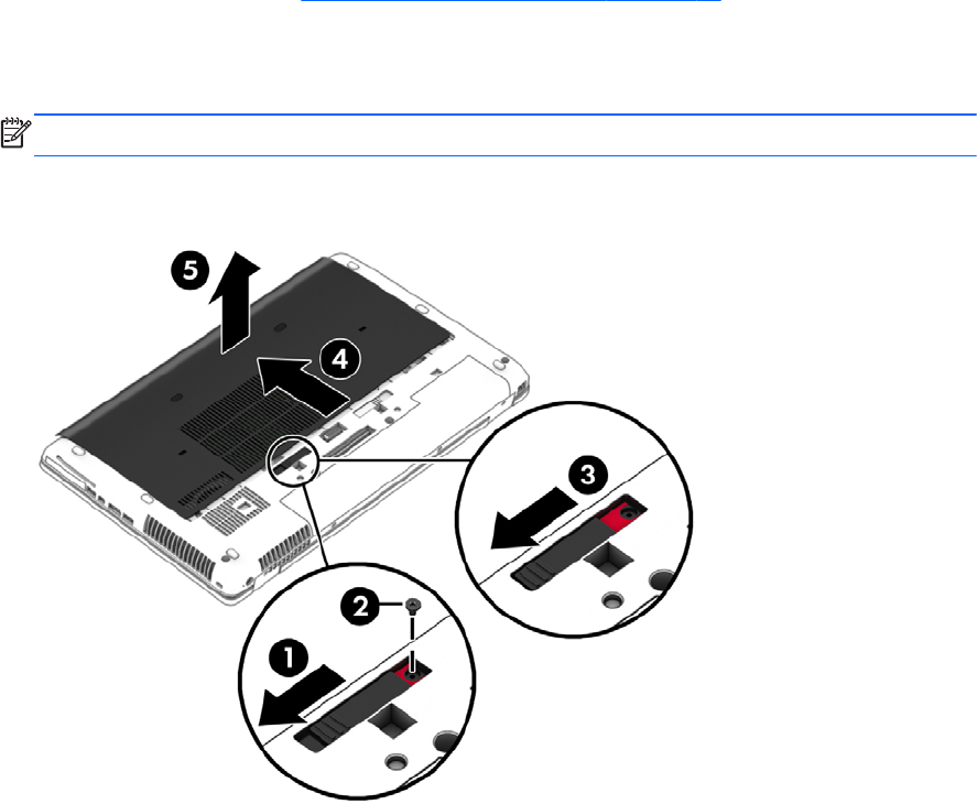 2. S ležištem baterije okrenutim prema vama, gurnite zasun za otpuštanje servisnog poklopca (1)