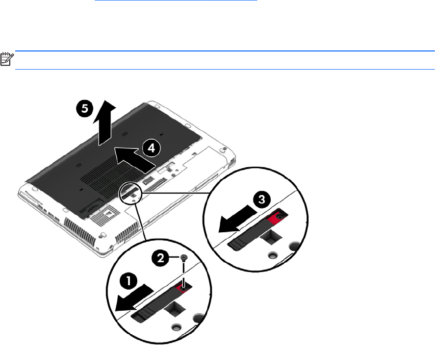 3. Skjut serviceluckan mot datorns framsida (4) och lyft sedan (5) bort serviceluckan.