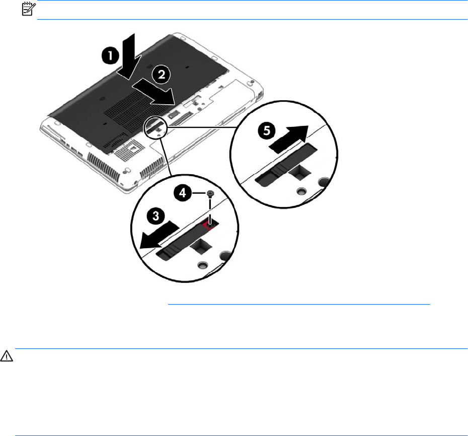 4. Suuntaa akkupaikka itseäsi kohti, työnnä huoltokannen vapautussalpaa vasemmalle (3), aseta