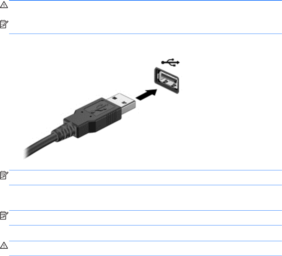 VAROITUS: Käytä mahdollisimman vähän voimaa USB-laitteen liittämisessä, jotta USB-liitin ei