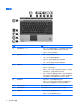 顶部组件 指点设备 组件 说明 (1) 指点杆 移动指针,选择或激活屏幕上的各个项目。 (2) 指点杆左按钮 功能类似于外接鼠标的左键。 (3) 触摸板* 移动指针,选择或激活屏幕上的各个项目。 (4) 触摸板左按钮* 功能类似于外接鼠标的左键。 (5) 指点杆右按钮 功能类似于外接鼠标的右键。 (6) 触摸板滚动区* 向上或向下滚动。 (7) 触摸板右按钮* 功能类似于外接鼠标的右键。 *此表介绍的是出厂时的设置。要查看或更改指点设备首选项,请选择 Start(开始)> Control Panel(控制面板)> Hardware and Sound(硬件和声音)> Mouse(鼠标)。 顶部组件 3