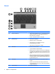Komponent Beskrivning (6) Num lock-lampa Tänd: Num lock eller det inbäddade numeriska tangentbordet är aktiverat. (7) Lampa för avstängt ljud ● Tänd: Datorljudet är påslaget. ● Gulbrun: Datorljudet är avstängt. (8) Lampa för nedsatt ljud Blinkande: Volymens rullningszon används för att sänka högtalarvolymen. (9) Lampa för höjt ljud Blinkande: Volymens rullningszon används för att höja högtalarvolymen. *De två lamporna för trådlöst visar samma information.