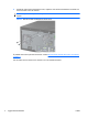 13. Riposizionare il pannello sottostante (ruotarlo di 90º), quindi farlo scattare in posizione nel frontalino. NOTA: l'aspetto del computer in uso potrebbe essere diverso dall'illustrazione mostrata di seguito. Figura 40 Cambio di configurazione da desktop a minitower 14. Nella parte posteriore del frontalino della workstation Z200, premere le linguette di montaggio con il logo HP (1) e tirare il logo verso l'esterno (2) come mostrato nell'illustrazione seguente.