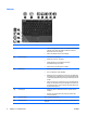 Lampor Komponent Beskrivning (1) ● Tänd: En inbyggd trådlös enhet, t ex ett trådlöst lokalt nätverk (WLAN), HP-modulen för trådlöst bredband och/eller en Bluetooth®-enhet, är påslagen. ● Släckt: Alla trådlösa enheter är avstängda. ● Tänd: Datorn är påslagen. ● Blinkande: Datorn är i sömnläge. ● Snabbt blinkande: En nätadapter med högre strömklassificering bör anslutas. ● Släckt: Datorn är avstängd eller i viloläge. ● Gulbrun: Ett batteri laddas. ● Grön: Ett batteri är nästan fulladdat.