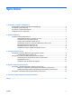 Indeks B blok klawiszy, wbudowany korzystanie 12 położenie 11 przełączanie funkcji klawiszy 12 włączanie i wyłączanie 12 C Composite Video 6 czujnik światła otaczającego skrót klawiaturowy 6 ustawianie 10 D drążek wskazujący korzystanie 3 I informacje o poziomie naładowania baterii 6 K klawiatura numeryczna, zewnętrzna korzystanie 12 num lock 12 klawisze funkcyjne 4 klawisz fn 4 M menu Q 10 mysz, zewnętrzna podłączanie 3 ustawianie preferencji 2 N num lock, zewnętrzna klawiatura numeryczna 12 14 Indeks