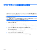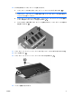 メモリ モジュールの追加または交換 お使いのコンピュータには、1 基のメモリ モジュール コンパートメントが本体の裏面に装備されてい ます。コンピュータのメモリを増設するには、メイン メモリ モジュール スロットに装着されている メモリ モジュールをアップグレードします。 警告! 感電や装置の損傷を防ぐため、電源コードとすべてのバッテリを取り外してからメモリ モジ ュールを取り付けてください。 注意: 静電気(ESD)によって電子部品が損傷することがあります。作業を始める前に、アースさ れた金属面に触るなどして、身体にたまった静電気を放電してください。 メモリ モジュールを追加または交換するには、以下の手順で操作します。 1. 必要なデータを保存します。 2. コンピュータをシャットダウンし、ディスプレイを閉じます。 コンピュータの電源が切れているのかハイバネーション状態なのかわからない場合は、まずコン ピュータの電源を入れ、次にオペレーティング システムの通常の手順でシャットダウンします。 JAWW 3. コンピュータに接続されているすべての外付けデバイスの接続を外します。 4.