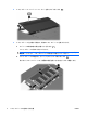 . メモリ モジュール コンパートメント カバーを持ち上げて外します(2) 。 9. メモリ モジュールを交換する場合は、既存のメモリ モジュールを取り外します。 a. モジュールの両端の留め具を外側に引っ張ります(1) 。 メモリ モジュールが斜めに持ち上がります。 注意: メモリ モジュールの損傷を防ぐため、メモリ モジュールを扱うときは必ず左右の 端を持ってください。メモリ モジュール上の部品には触らないでください。 b.