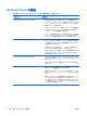自動 DriveLock によるハードドライブのプロテクトの有効/無効の設定 このオプションが有効になっていると、DriveLock パスワードがドライブ内で自動的に生成および設 定され、TPM 内蔵セキュリティ チップによって保護されます。 注記: コンピュータを再起動し、パスワードの入力画面で正しい TPM 内蔵セキュリティ パ スワードを入力するまでは、自動的に生成されたパスワードは設定されません。 自動 DriveLock を有効にするオプションは、コンピュータに TPM セキュリティ チップが内蔵され初 期化されており、かつ有効な DriveLock パスワードがない場合にのみ利用できます。 TPM セキュリ ティ チップを有効にして初期化する手順については、34 ページの 「内蔵セキュリティ チップの有効 化」および35 ページの 「内蔵セキュリティ チップの初期化」を参照してください。 注記: コンピュータに DriveLock パスワードがすでに手動で設定されている場合は、自動 DriveLock によるプロテクトを有効にする前に、まず設定されているパスワードを無効にする 必要があります。 自