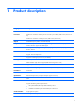 Category Description Operating system Preinstalled: Serviceability ● Windows 7 Home Basic (64- and 32-bit) ● Windows 7 Home Premium (64- and 32-bit) ● Windows 7 Professional (64- and 32-bit) End-user replaceable part: AC adapter 3