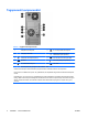 - Tagapaneeli komponendid Tabel 1-3 Tagapaneeli komponendid 1 toitejuhtme ühenduspesa 6 RJ-45-tüüpi kaabli ühenduspesa 2 Toitepinge ümberlüliti 7 heliväljundi pistikupesa toitega heliseadmete jaoks (roheline) 3 helisisendi ühenduspesa (sinine) 8 PS/2-klaviatuuri ühenduspesa (lilla) 4 jadaliides 9 PS/2-hiire pistikupesa (roheline) 5 kuvarikaabli ühenduspesa 10 USB-liides MÄRKUS. Ühenduspesade arv ja paigutus võib mudeliti erineda.