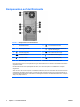 - Komponenten auf der Rückseite Tabelle 1-3 Komponenten auf der Rückseite 1 Netzkabelanschluss 6 RJ-45-Netzwerkanschluss 2 Spannungsumschalter 7 Audio-Ausgang für Audio-Geräte mit eigenem Netzteil (grün) 3 Audio-Eingang (blau) 8 PS/2-Tastaturanschluss (lila) 4 Serieller Anschluss 9 PS/2-Mausanschluss (grün) 5 Monitoranschluss 10 Universal Serial Bus (USB) HINWEIS: Die Anordnung und Anzahl der Anschlüsse kann von Modell zu Modell unterschiedlich sein.