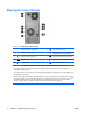 - Εξαρτήματα πίσω πλευράς Πίνακας 1-3 Εξαρτήματα πίσω πλευράς 1 Υποδοχή καλωδίου τροφοδοσίας 6 Υποδοχή δικτύου RJ-45 2 Διακόπτης επιλογής τάσης 7 Υποδοχή εξόδου για συσκευές ήχου που τροφοδοτούνται με ρεύμα (πράσινη) 3 Υποδοχή εισόδου ήχου (μπλε) 8 Υποδοχή πληκτρολογίου PS/2 (μωβ) 4 Σειριακή υποδοχή 9 Υποδοχή ποντικιού PS/2 (πράσινη) 5 Υποδοχή οθόνης 10 USB (Universal Serial Bus) ΣΗΜΕΙΩΣΗ Η διάταξη και ο αριθμός των υποδοχών ενδέχεται να ποικίλλουν ανάλογα με το μοντέλο.