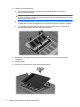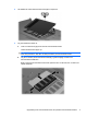 12. Luk dækslet (2). 13. Stram skruen på dækslet til hukommelsesmodulrummet (3). 14. Sæt batteriet i igen. 15. Løft computerens højre side, og tilslut derefter ekstern strøm samt eksterne enheder igen. 16. Tænd computeren. Opgradering af et hukommelsesmodul i den primære hukommelsesmodulslot Sådan opgraderer du et hukommelsesmodul i den primære hukommelsesmodulslot: 1. Gem dataene. 2. Luk computeren ned.