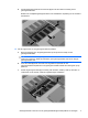 8. Verwijder het afdekplaatje van het geheugenmodulecompartiment van de computer (2). 9. Verwijder de geheugenmodule als volgt: a. Trek de borgklemmetjes aan beide zijden van de geheugenmodule weg (1). De geheugenmodule komt omhoog. VOORZICHTIG: Houd de geheugenmodule alleen vast aan de randen, om schade aan de module te voorkomen. Raak de onderdelen van de geheugenmodule niet aan. b. Pak de geheugenmodule aan de rand vast (2) en trek de module voorzichtig uit het geheugenmoduleslot.