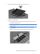 12. Schließen Sie die Abdeckung (2). 13. Ziehen Sie die Sicherungsschraube an der Abdeckung des Speichermodulfachs (3) fest. 14. Setzen Sie den Akku wieder ein. 15. Drehen Sie den Computer wieder um, und schließen Sie die externe Stromversorgung und Peripheriegeräte wieder an. 16. Schalten Sie den Computer ein. Aufrüsten eines Speichermoduls im primären Speichersteckplatz Um ein Speichermodul im primären Speichersteckplatz aufzurüsten, führen Sie folgende Schritte aus: 1. Speichern Sie Ihre Daten. 2.