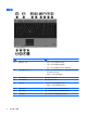 顶部组件 指点设备 组件 说明 (1) 指点杆* 移动指针,选择或激活屏幕上的项。 (2) 指点杆左按钮* 功能类似于外接鼠标的左键。 (3) 触摸板* 移动指针,选择或激活屏幕上的项。 (4) 触摸板左按钮* 功能类似于外接鼠标的左键。 (5) 触摸板中间按钮* 功能类似于外接鼠标的中键。 (6) 触摸板右按钮* 功能类似于外接鼠标的右键。 (7) 触摸板滚动区 向上或向下滚动。 (8) 指点杆右按钮* 功能类似于外接鼠标的右键。 (9) 指点杆中间按钮* 功能类似于外接鼠标的中键。 *此表介绍出厂设置。要查看或更改指点设备首选项,请选择开始 > 控制面板 > 打印机和其它硬件 > 鼠标。 顶部组件 3