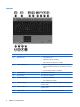 Lampor Komponent Beskrivning (1) ● Tänd: Datorn är på. ● Blinkande: Datorn är i vänteläge. ● Släckt: Datorn är avstängd eller i viloläge. ● Tänd: En inbyggd trådlös enhet, till exempel en enhet för trådlöst lokalt nätverk (WLAN) och/eller en Bluetooth®-enhet, är på. ● Gul: Alla trådlösa enheter är avstängda. (2) 4 Strömlampor (2)* Lampor för trådlöst (2)† (3) Caps lock-lampa Tänd: Caps lock är aktiverat. (4) Num lock-lampa Tänd: Num lock är aktiverat.