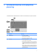 1 Strömkontrollernas och lampornas placering I nedanstående bild och tabell identifieras och beskrivs var strömkontroller och lampor är placerade. (1) (2) Komponent Beskrivning Strömlampor (2)* ● Tänd: Datorn är påslagen. ● Blinkande: Datorn är i sömnläge. ● Släckt: Datorn är avstängd eller i viloläge. ● Gulbrun: Ett batteri laddas. ● Turkos: Ett batteri är nästan fulladdat. ● Blinkande gulbrun: Ett batteri som är datorns enda tillgängliga strömkälla når låg batteriladdningsnivå.