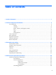 Table of contents 1 Product description ........................................................................................................... 1 2 External component identification ..................................................................................... 9 Top components ....................................................................................................................... 9 Display ............................................................................................