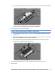 9. Irrota näppäimistö työntämällä neljää näppäimistön vapautussalpaa. 10. Nosta näppäimistön yläreunaa varovasti ja kallista näppäimistöä niin, että se nojaa tietokoneen kämmentukeen. HUOMAUTUS: Jos näppäimistön vasen puoli vapautuu ennen oikeaa puolta, voit vapauttaa oikean puolen työntämällä näppäimistöä hieman vasemmalle. 11. Irrota muistimoduuli seuraavasti: a. Vedä ulospäin muistimoduulin sivuilla olevat pidikkeet (1). Muistimoduuli kallistuu ylöspäin.
