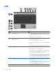 왼쪽면 부품 부품 (1) 설명 통풍구 통풍구를 통해 공기가 유입되어 내부 부품의 온도를 식혀줍니다. 주: 컴퓨터 팬은 자동으로 작동되어 내부 부품을 냉각하고 과열 을 방지합니다. 일상적인 작동 중 내부 팬이 돌아가고 멈추는 것은 정상적인 현상입니다. 12 2장 (2) USB 포트(2 개) 선택 사양인 USB 장치를 연결합니다. (3) 1394 포트 캠코더 같은 IEEE 1394 또는 1394a 장치(선택 사양)를 연결합니 다. (4) 오디오 입력(마이크) 잭 선택 사양인 컴퓨터 헤드셋 마이크, 스테레오 어레이 마이크 또는 모노 마이크를 연결합니다. (5) 오디오 출력(헤드폰) 잭 선택 사양인 전원 공급형 스테레오 스피커, 헤드폰, 이어폰, 헤드 셋 또는 TV 오디오에 연결된 경우 사운드를 생성합니다. (6) ExpressCard slot(ExpressCard 슬롯) ExpressCard(선택 사양)를 지원합니다.