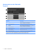 Komponenten an der Vorderseite Komponente Beschreibung (1) Leuchtet: Ein integriertes Wireless-Gerät, z. B. ein WLAN-Gerät, das HP UMTS-Modul und/oder ein Bluetooth-Gerät, ist eingeschaltet. Wireless-LED Leuchtet gelb: Alle Wireless-Geräte sind ausgeschaltet. (2) (3) (4) Betriebsanzeige Akkuanzeige Laufwerksanzeige ● Leuchtet: Der Computer ist eingeschaltet. ● Blinkt: Der Computer befindet sich im Standbymodus. ● Blinkt schnell: Schließen Sie ein Netzteil mit einer höheren Nennleistung an.