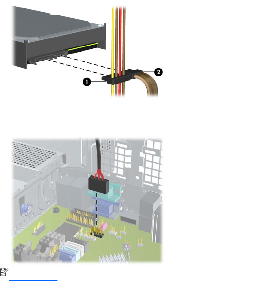 a. Če nameščate drugi trdi disk, priključite napajalni kabel (1) in podatkovni kabel (2) na