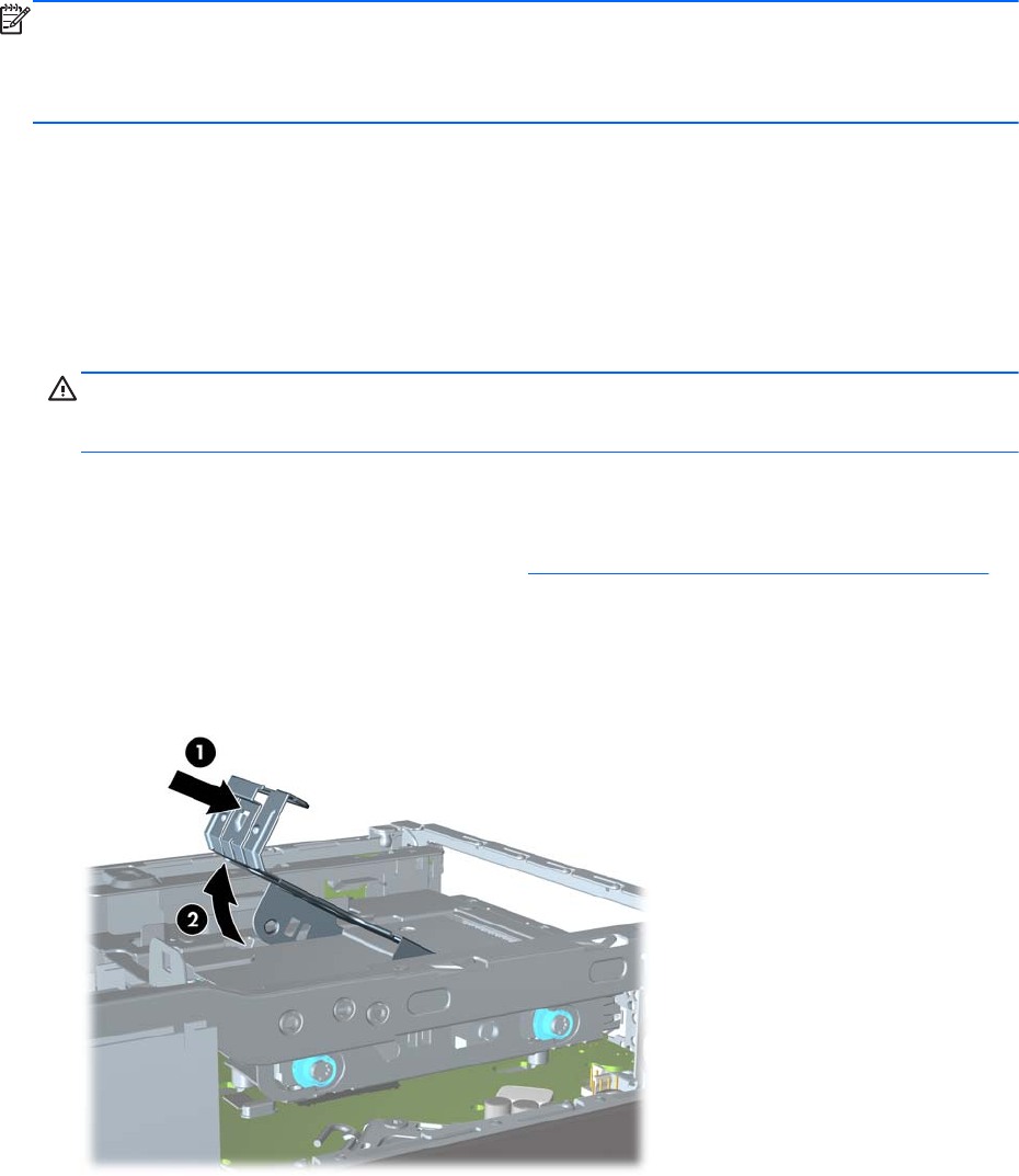 8. Pritisnite levo sprostitveno zaponko na levi strani nosilca trdega diska (1) in nato obrnite ročaj