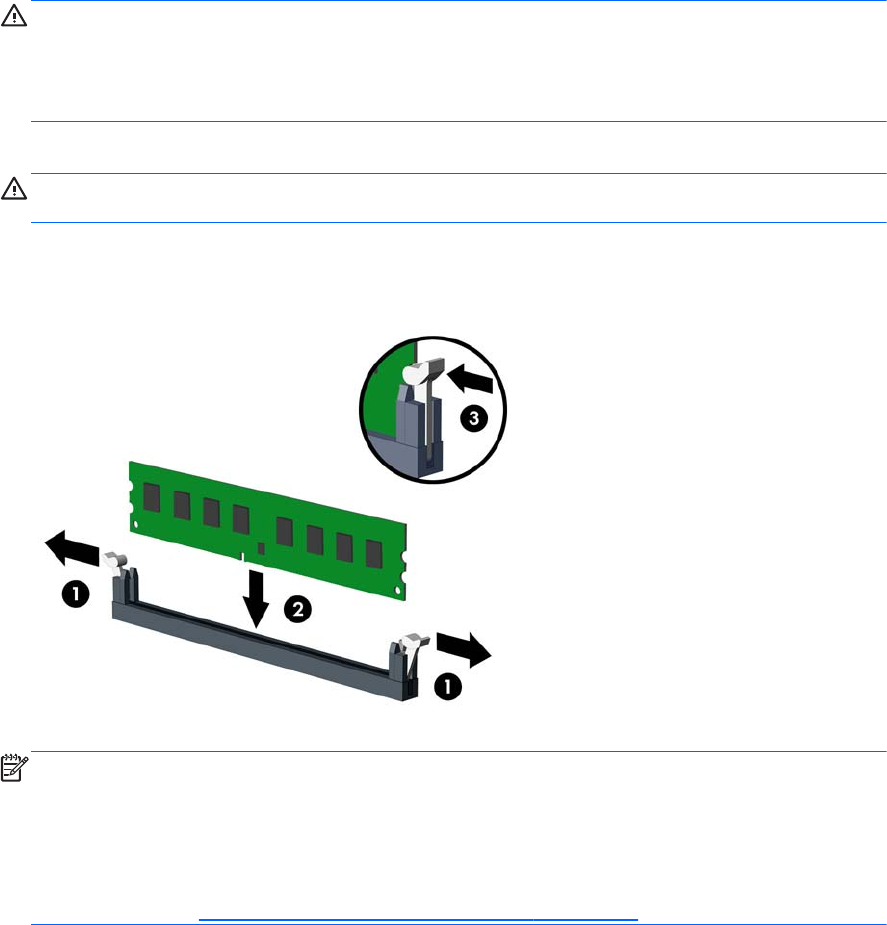 6. Odprite oba zaklepa podnožja za pomnilniški modul (1) in vstavite modul v podnožje (2).