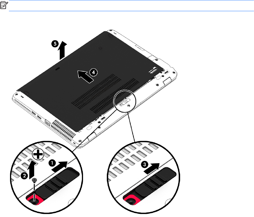 2. Servis kapağını bilgisayarın önüne doğru kaydırın (4) ve servis kapağını kaldırıp çıkarın (5).