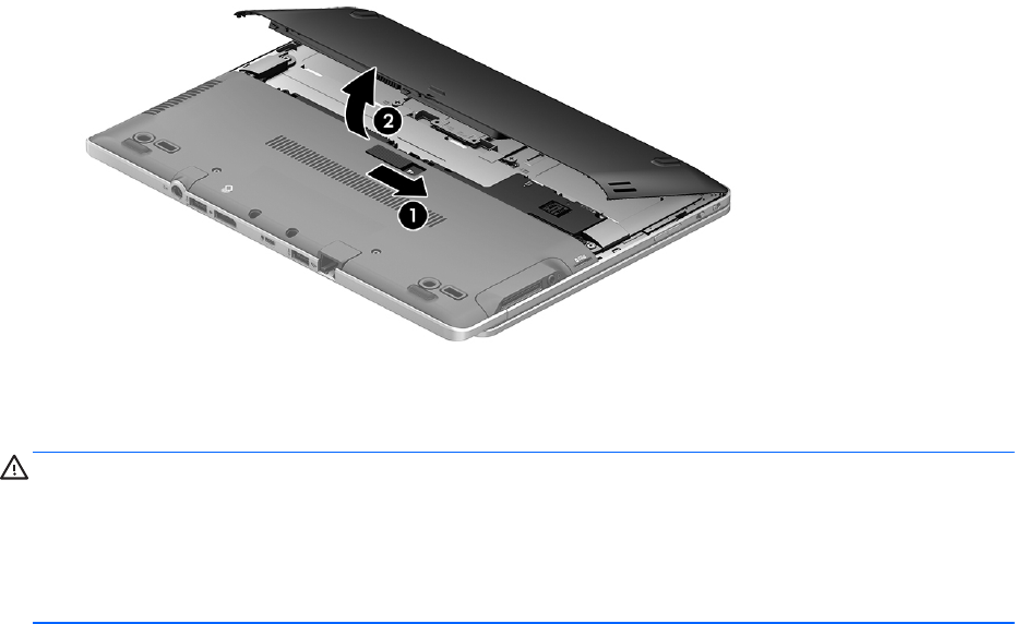 3. Pagrieziet akumulatoru uz augšu un izņemiet to no datora (2).