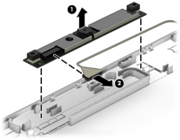 b. Detach the webcamera/microphone module (2) from the display enclosure. (The webcamera/
