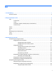 Indeks A adaptor AC, menguji 52 alat penunjuk, mengeset preferensi 28 antena nirkabel, mengenali 16 antena WLAN, mengenali 16 antena WWAN, mengenali 16 B baterai membuang 50 menampilkan sisa daya baterai 47 mengganti 50 menghemat daya 49 mengosongkan 47 menyimpan 50 tingkat sediaan daya baterai yang rendah 48 bepergian dengan membawa komputer 50, 101, 103 BIOS memperbarui 93 menentukan versi 94 mengunduh pembaruan 94 C cantelan, pelepas penutup akses 19 cantelan pelepas penutup akses 19 Computer Setup menav