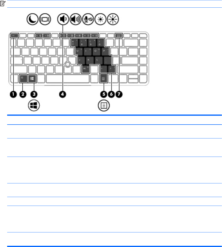 (7) num lk key Turns the embedded numeric keypad on and off when pressed