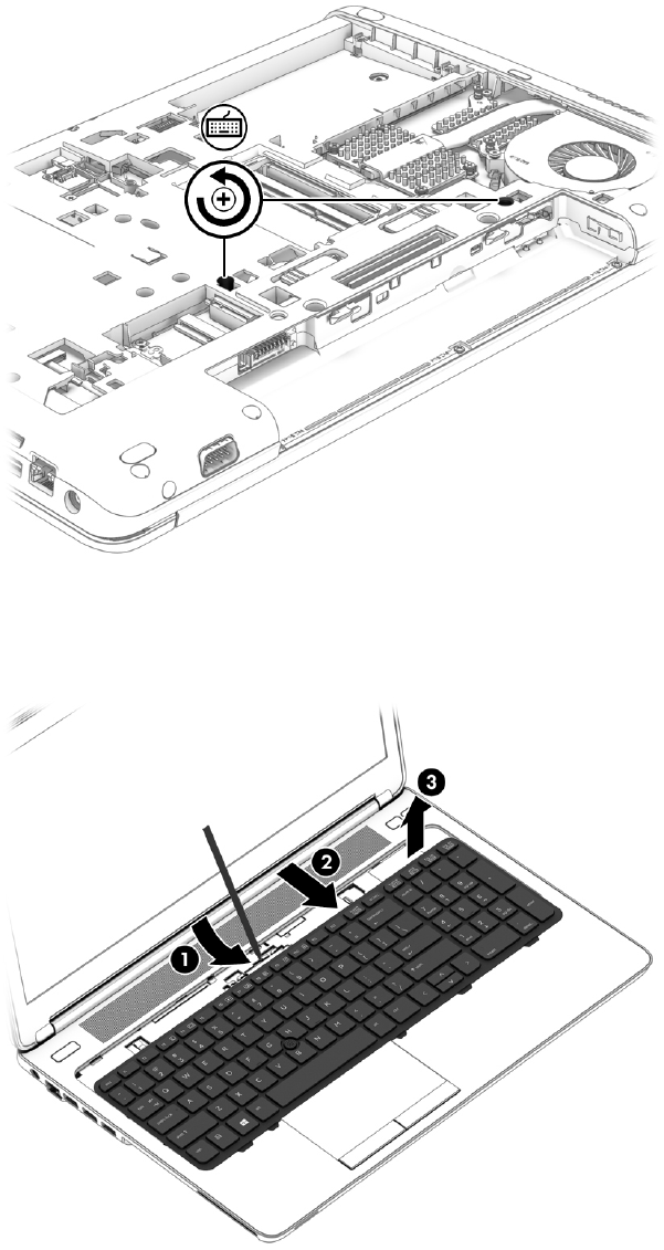 3. Insert a thin tool (1) to loosen the tabs on the rear edge of the keyboard (2), and then lift the rear edge