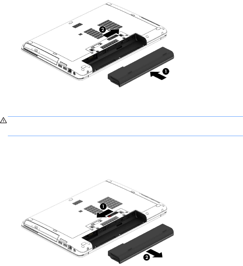 2. バッテリ ベイにバッテリを挿入し、しっかりと収まるまで押し込みます(1)。