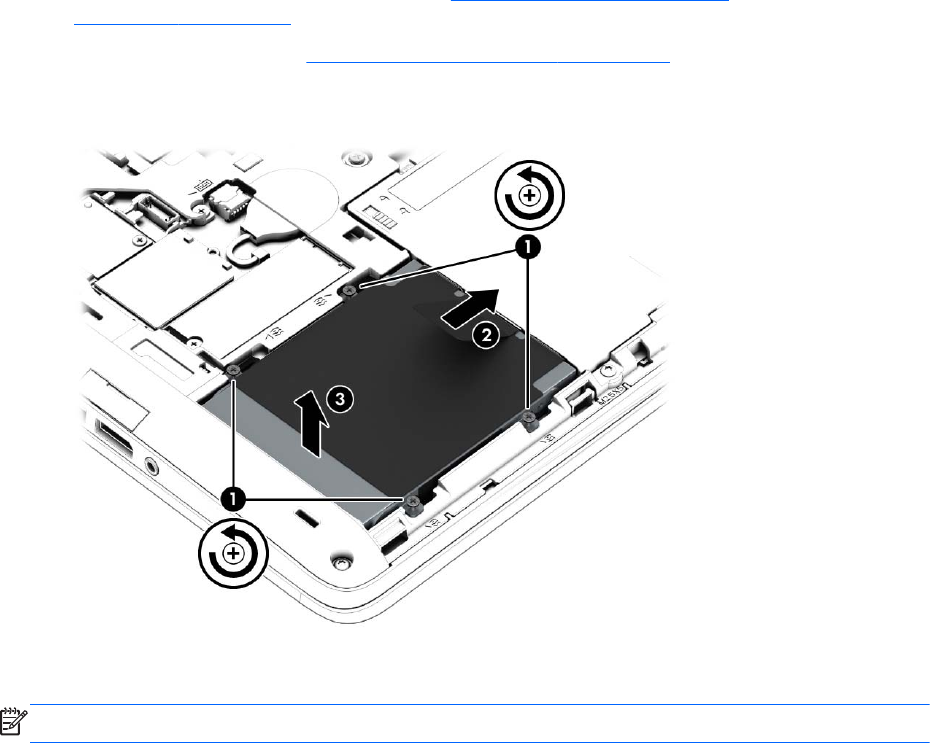 6. Atsukite 4 standžiojo disko varžtus (1). Pastumkite standųjį diską (2) į priekį ir išimkite standųjį