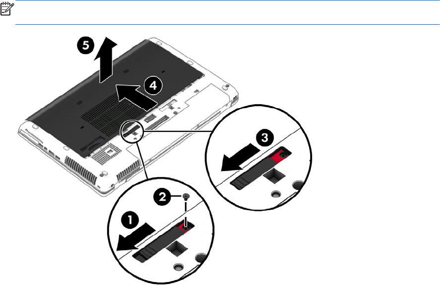 2. Med batterifacket mot dig, ta bort skruven (1), skjut serviceluckans frigöringsspärr (2) till vänster