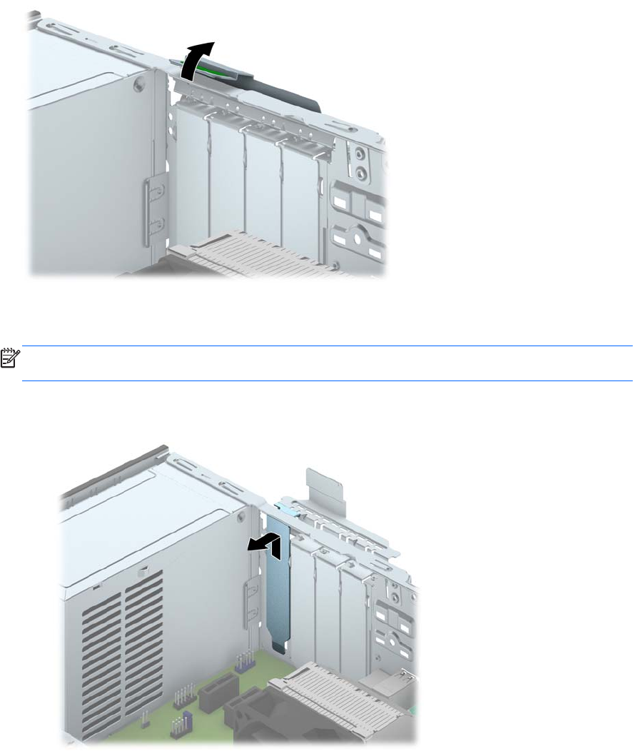8. スロット カバーを固定しているスロット カバー固定ラッチの緑色のタブを持ち上げ、外側に回