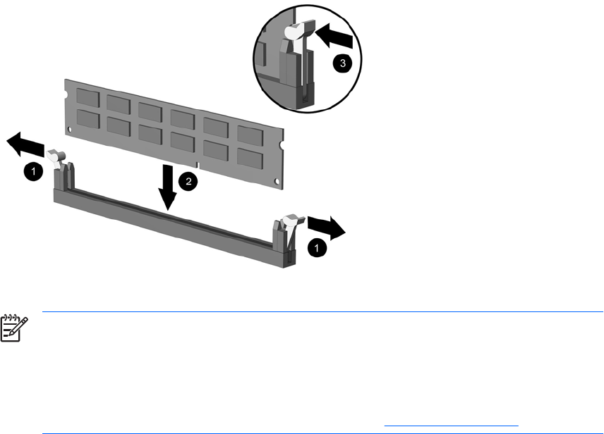 8. เปดสลักทั้งสองดานของซ็อกเก็ตโมดูลหนวยความจำ (1) และใสโมดูลหนวยความจำลงในซ็อกเก็ต (2)