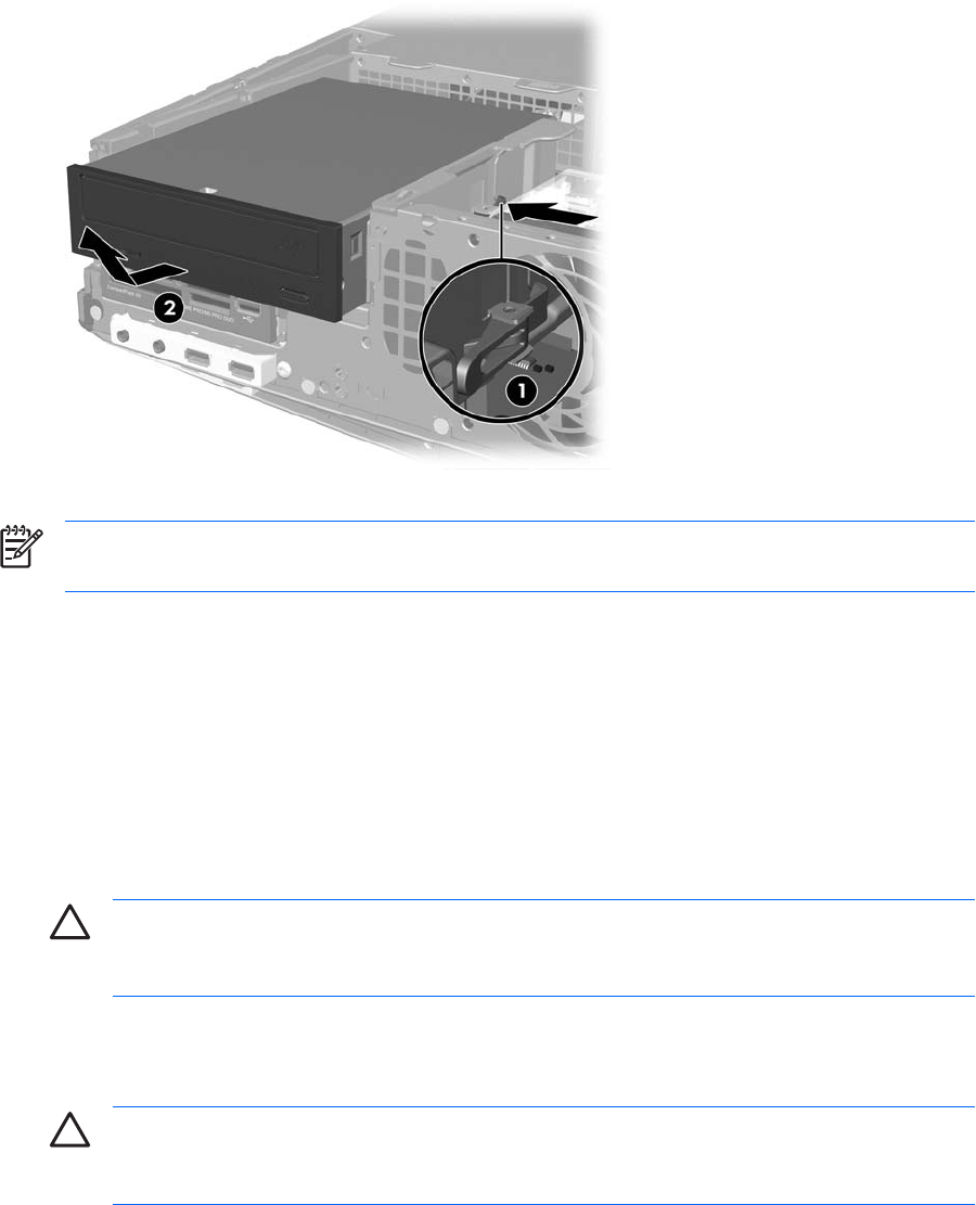 10. กดสลักยึดไดรฟสีเขียว (1) ที่ดานขางของไดรฟเพื่อคลายไดรฟออกจากโครงไดรฟ ขณะที่กดสลักยึดไดรฟ ใหเลื่อน