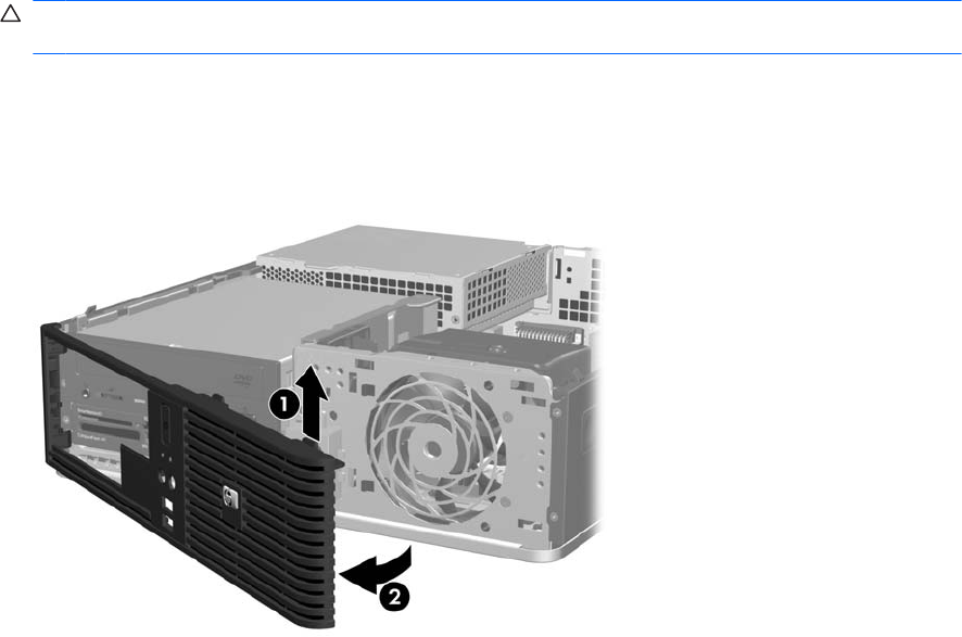 提起面板右上侧后面的绿色锁定器 (1),然后拉动面板,先使其右侧脱离机箱 (2),再使其左侧脱离