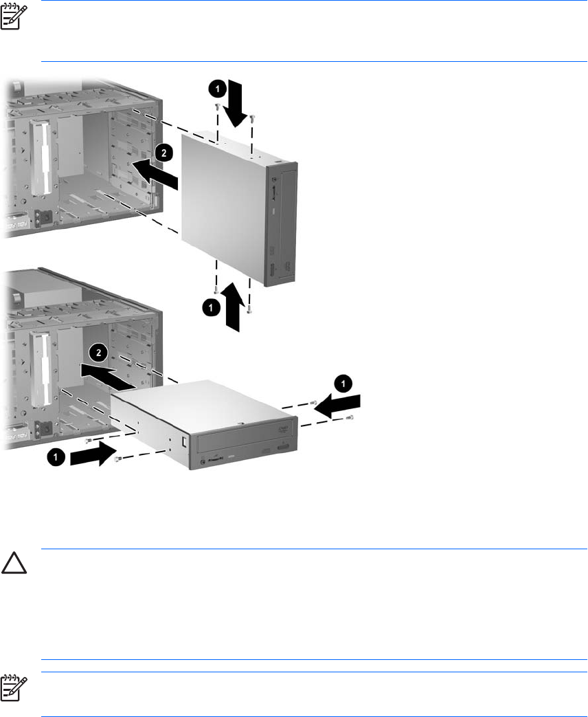 Figure 2-19 Installing a 5.25-Inch Drive in a Minitower (top) and Desktop (bottom)