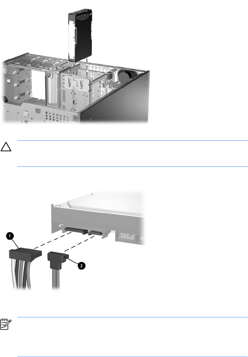 8. Connect the power cable (1) and data cable (2) to the rear of the hard drive.