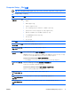 Computer Setup – Security(보안) 주 특정 Computer Setup 옵션에 대한 지원 여부는 하드웨어 구성에 따라 다를 수 있습니다. 표 4 Computer Setup – Security(보안) 옵션 설명 Smart Card Options(스 마트 카드 옵션)(일부 모 델) 파워온 암호 대신 사용할 스마트 카드를 활성화/비활성화할 수 있습니다. Setup Password(설정 암호) 설정(관리자) 암호를 설정 및 활성화할 수 있습니다. 주 설정 암호를 설정한 경우 Windows 환경에서 Computer Setup 옵션을 변경하고, ROM 을 플래시하고, 변경 사항을 특정 플러그 앤 플레이 설정에 적용해야 합니다. 자세한 정보는 Documentation and Diagnostics CD 의 문제 해결 설명서를 참조하십시오. Power-On Password (파워온 암호) 파워온 암호를 설정 및 활성화할 수 있습니다. 전원 주기 후 파워온 암호 프롬프트가 표시됩니다.