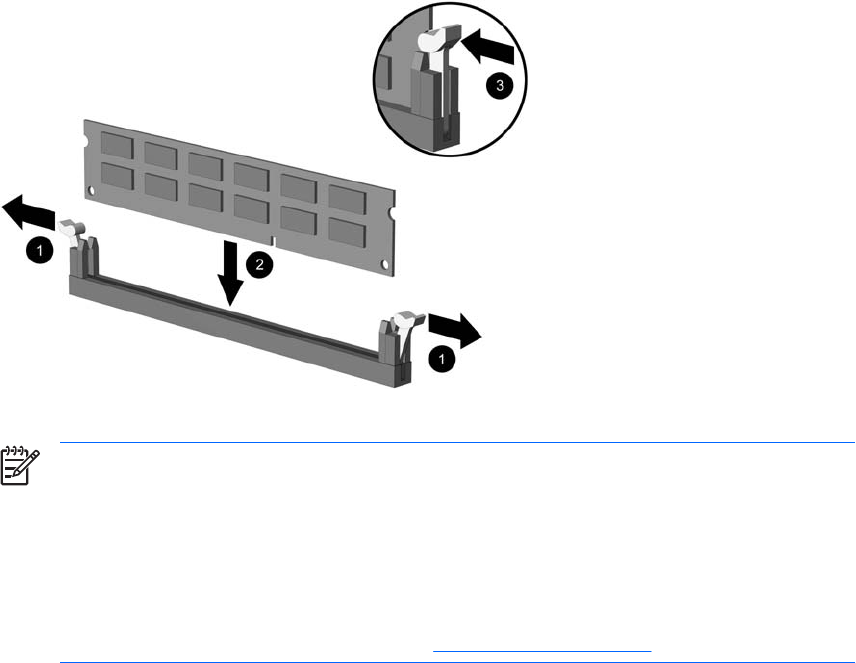 7. Avage mõlemad mälumooduli kinnitusklambrid (1) ning asetage mälumoodul kohale (2).