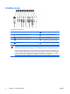 Billentyűzet 1-4 táblázat A billentyűzet részei 1 HUWW 1 Funkcióbillentyűk A használt alkalmazástól függően speciális feladatokat hajtanak végre. 2 Szerkesztő billentyűk A következő billentyűkből áll: Insert (Beszúrás), Home (Elejére), Page Up (Lapozás vissza), Delete (Törlés), End (Végére) és Page Down (Lapozás előre). 3 Állapotjelző LED-ek A számítógép és a billentyűzet beállításainak állapotát jelzik (Num Lock, Caps Lock és Scroll Lock).